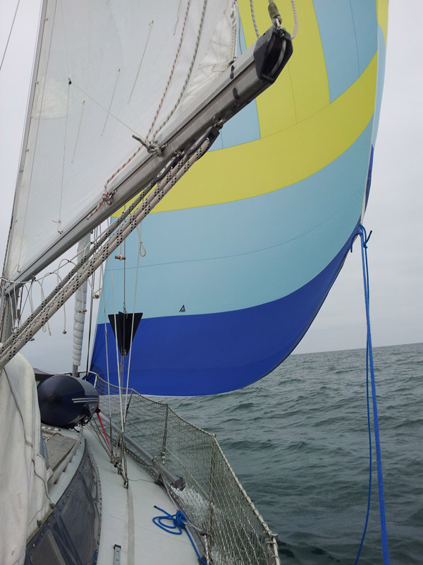 Het is redelijk weer, overwegend droog op wat natte wind na, maar veel minder zonnig dan voorspeld. Ook de wind valt wat tegen. Boven de eilanden varen we eerst halve wind en daarna helemaal voor de wind, met een uitgeboomde genua. Als de wind onder de 9 kn komt nemen we de genua weg en hijsen we de halfwinder, een lap zeil van ca 72 m². Daarmee komt de snelheid weer boven de 6 kn gemiddeld. Bij het weghalen van de halfwinder gaat wat mis, de halfwinder hangt als een vlieger naast de boot, best gevaarlijk, gelukkig staat er weinig wind. We krijgen de halfwinder niet meer fatsoenlijk opgeborgen en laten het zeil in het water zakken om het daarna op te ruimen.