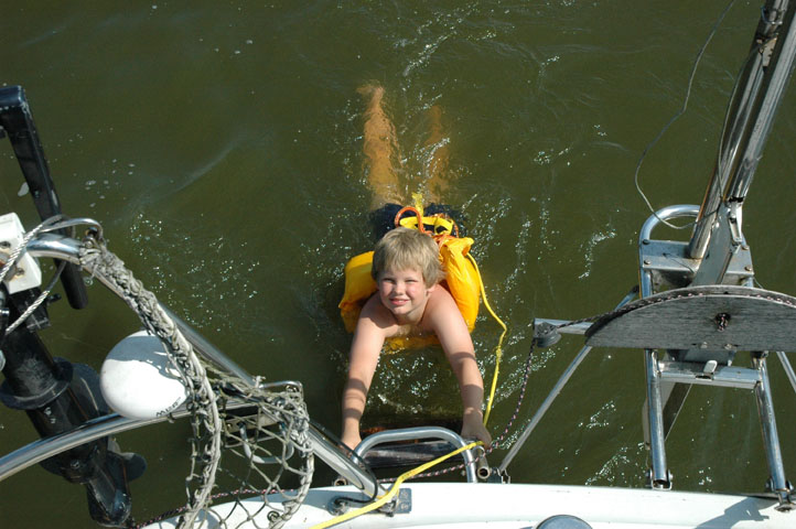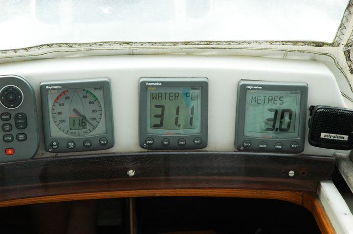 Onderweg loopt de temperatuur op tot tropische hoogte, in de schaduw wordt het 34 graden celcius, dat is ook op open water en zeker in een boot errug veel. Zeker als je in het centrum van een drukgebied terecht komt en de wind geheel wegvalt. Geen zucht, een rimpelloze vlakte. De kinderen gaan zwemmen, maar wel gezekerd met een reddingslijn. De watertemperatuur is aan de oppervlakte circa 31 graden celcius. Zelfs pappa krijgt zin om te zwemmen, maar wil als schipper toch niet van boord.