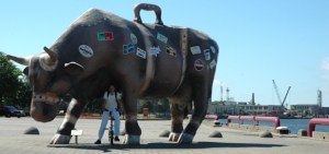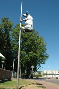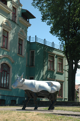 Na het ontbijt op onze fietsjes, wat zijn we daar toch blij mee, de stad in. We voelen al snel een band met thuis. Overal waar we kijken komen we koeien tegen! In het kader van de Koeienparade, voor het eerst gehouden in 1998 te Zurich (Zwitsterland) is hier in 2002 een koeiententoonstelling gehouden. Prominente Letse kunstenaars is gevraagd iets met de koeien te doen.