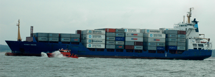Bij onze aankomst in Kleipeda, een serieuze haven, komt een groot Containerschip naar buiten, we zien hoe de loods opgehaald wordt. Direct na ons vaart een groot cruiseschip naar binnen, zie ook volgende blog.