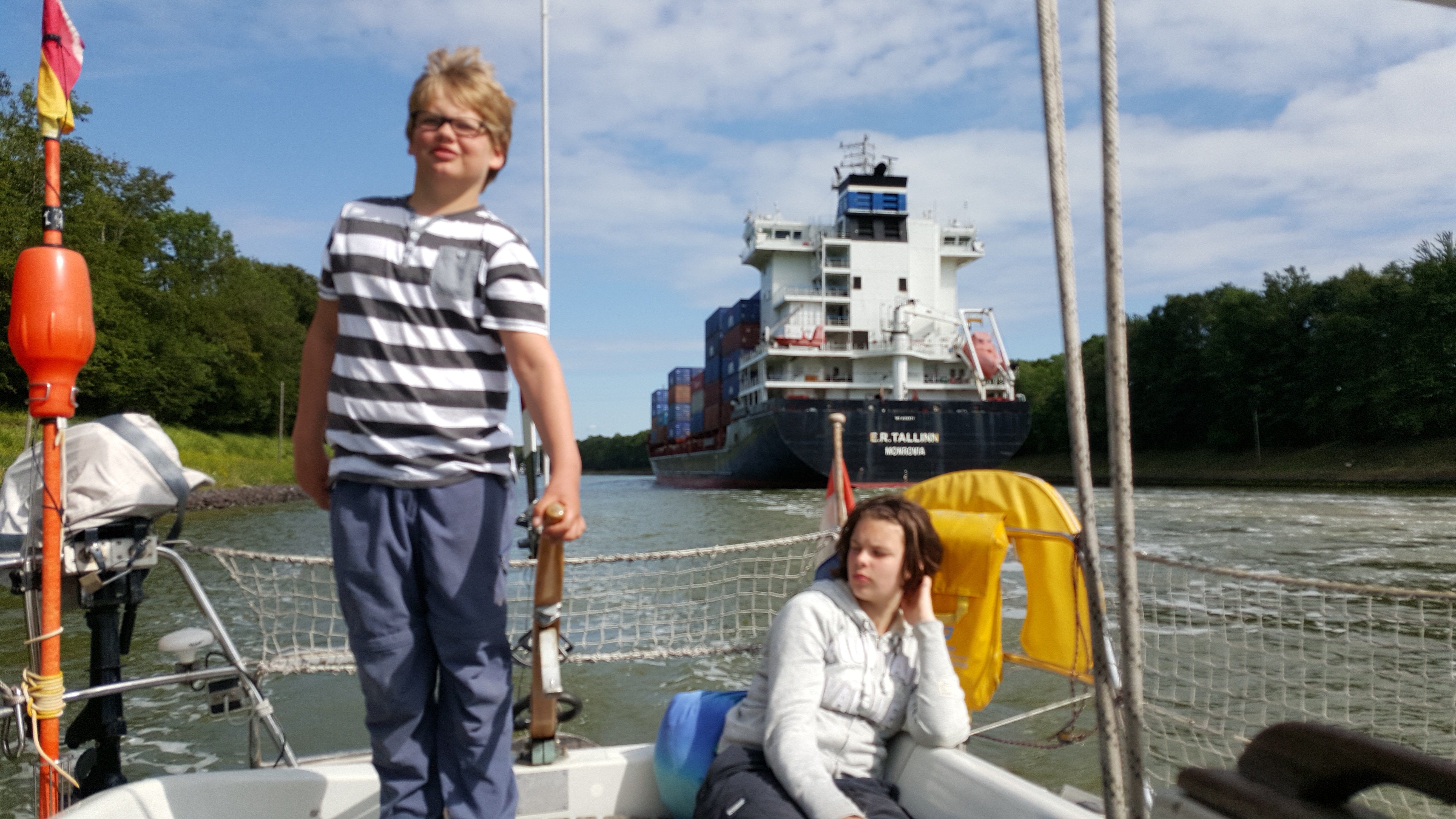 Duitsers staan overal netjes in de rij, maar bij bruggen en sluizen probeert er altijd eentje om er tussendoor te naaien. We liggen al vroeg te wachten bij Holtenau, maar pas na 2 uur zijn we door de sluis. Bah, wat een vervelend saai stuk water, dat Noordoostzee Kanaal. Als je hier vaker bent geweest en het samen met grote schepen varen routine is geworden wordt het vechten tegen de slaap. Stuurautomaat aan, tegen de wind in motoren, gedichten lezen (Ringelnatz is op, nu Marsman) en om de paar minuten even de koers controleren.