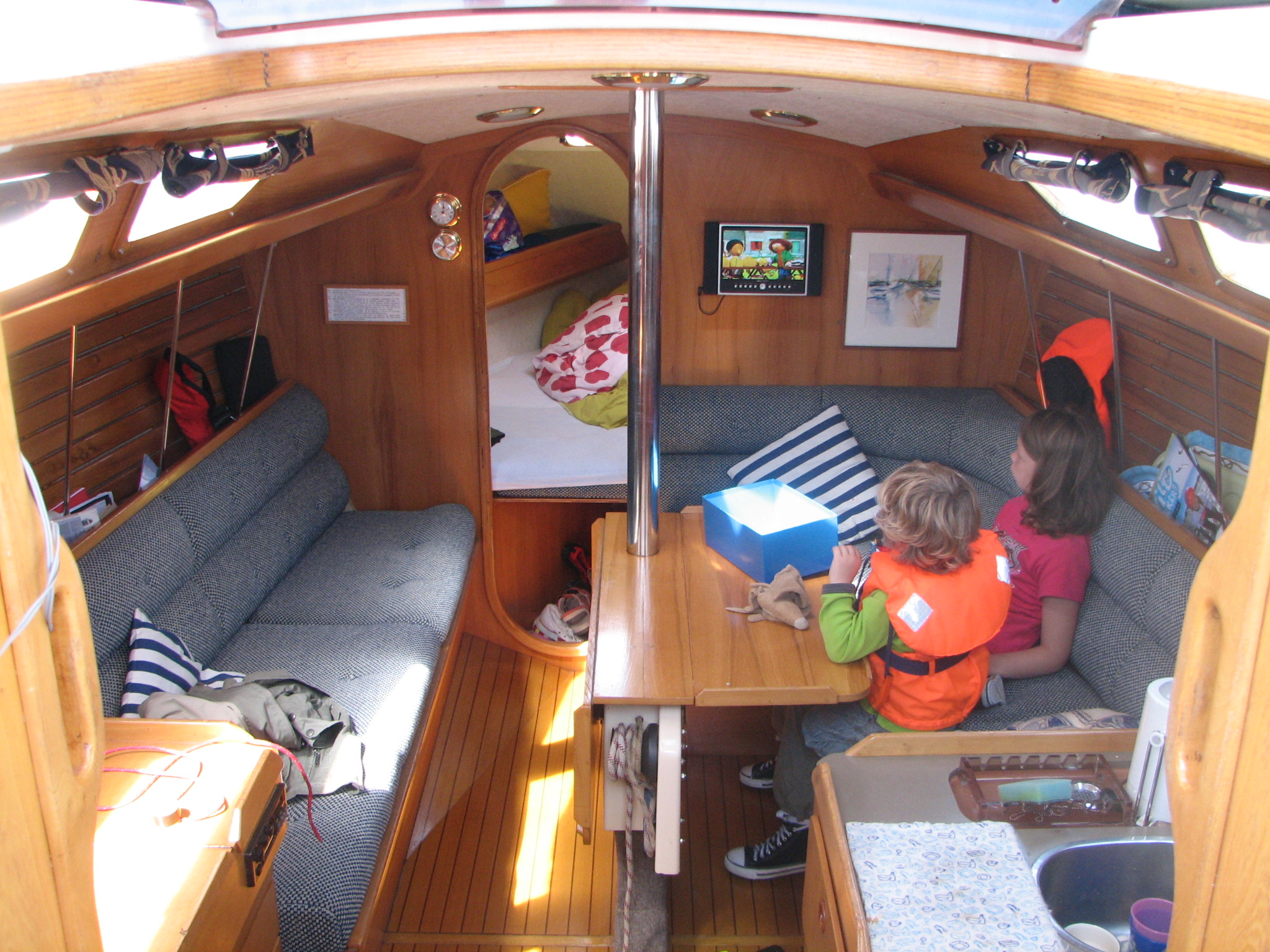 Van binnen voor zijn lengte groot, zowel voor als achter een slaapcabine. Een toilet met wasgelegenheid. Een keuken met oven, koelkast, werkblad en gootsteen. In de kajuit kan door het wegklappen van de tafel een 3e 2 persoons-slaapplek gemaakt worden, of bij storm geslapen worden.