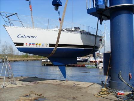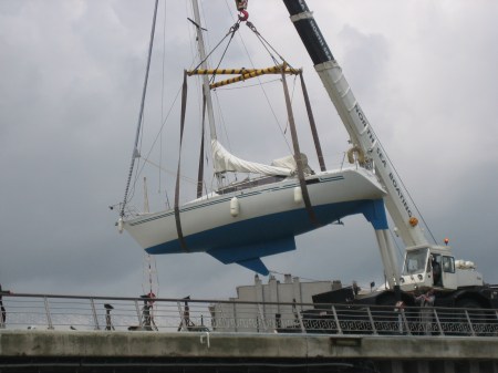 Hier hangt ie in de kraan, op DKNZ, met het Midzwaard maximaal uit. Zelfs zonder zwaard uit nog redelijke zeileigenschappen, omdat het gewicht in de ‘doos’ zit, onder het schip. Het zwaard zorgt vooral voor de stuurmogelijkheden en de eigenschappen hoog aan de wind.