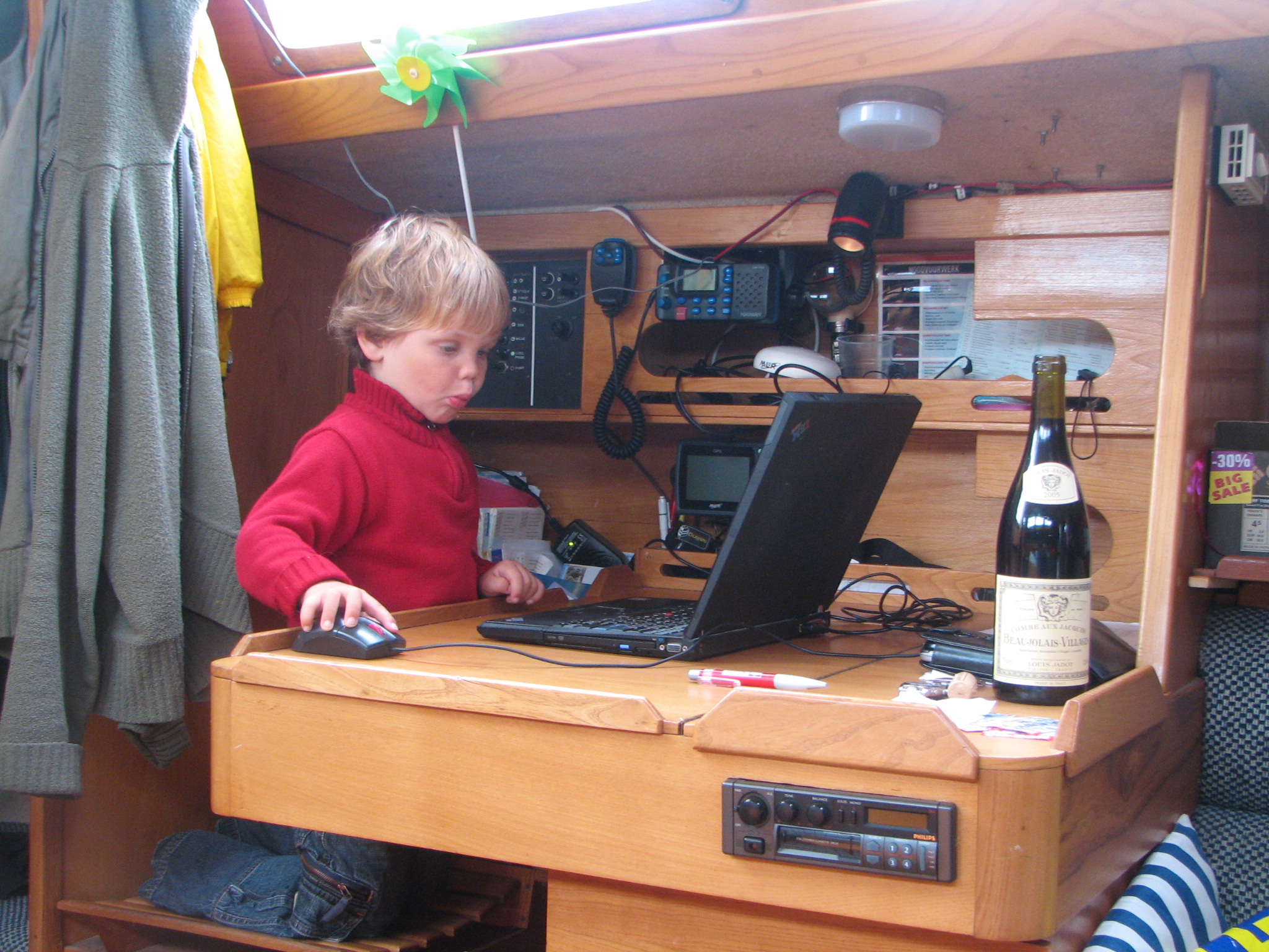 De navigatiehoek, ruim en traditioneel. Heel fijn vindenwij. Computer o.k., geen plek voor echte kaarten, n.o.k..