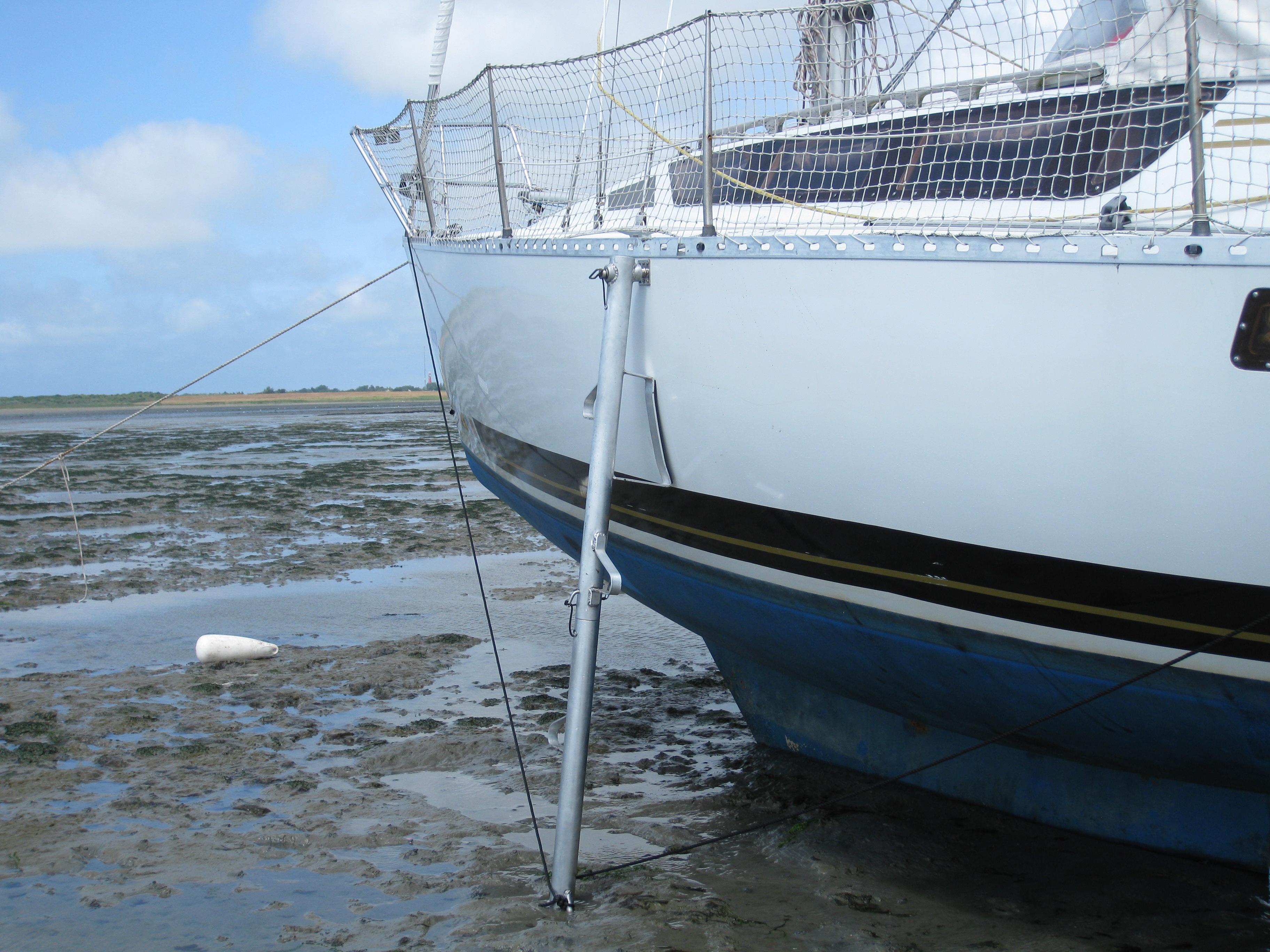 Onze Feeling 920 staat dus op zijn dooskiel (hoogte 60 cm), voor de stabiliteit worden wadpoten gebruikt (horen erbij, waren bij ons kwijt, hebben we laten maken, kopie kan…). De poten zitten aan voor- en achtersteven vast met een lijn, die uitzwaaien horizontaal en verticaal voorkomt. Bij het droogvallen wel even met een vaarboom checken of de bodem redelijk vlak is om scheefzakken te voorkomen.